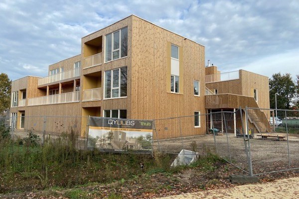 De nieuwe appartementen zijn gebouwd door Qyuubs in opdracht van ’thuis. Ze zijn volledig gemaakt van kruislaaghout (CLT). Dit materiaal is biobased en zorgt ervoor dat er minder CO₂ vrijkomt bij de bouw. Bouwen met CLT gaat snel, is van hoge kwaliteit en past goed bij de groene omgeving van Buurtschap te Veld.
