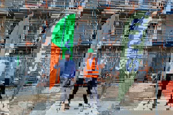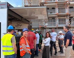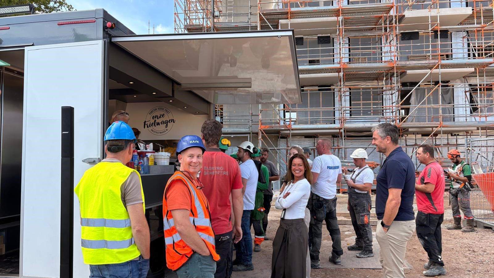 De bouw van de nieuwe Gildebuurt in Eindhoven gaat voorspoedig. Op vrijdag 19 september vierden we samen met BAM Wonen een mooie mijlpaal: het hoogste punt van fase 1A is bereikt! Tijdens een feestelijk moment hesen we de vlag en werden de bouwers in het zonnetje gezet en verwend met een frietje.