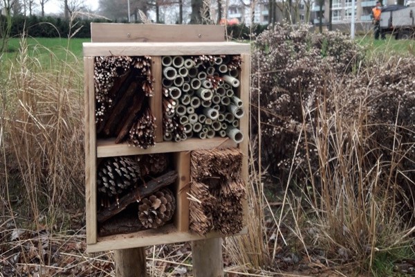 Een van die stappen is het plaatsen van meer insectenhotels en vogelhuisjes in de tuinen bij onze complexen.