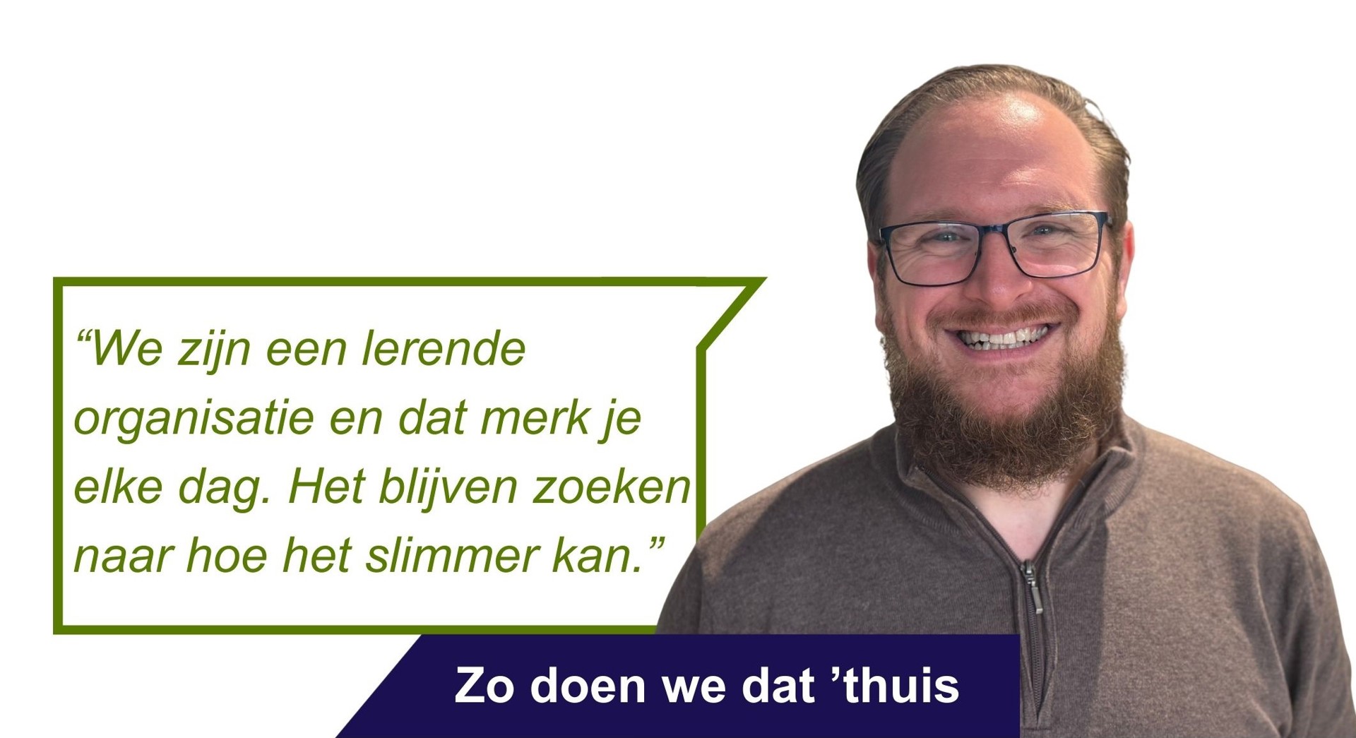 “Wat ik het leukste vind aan mijn werk? Het blijven zoeken naar hoe het slimmer kan. We zijn een lerende organisatie en dat merk je elke dag. Dat kan een kleine optimalisatie zijn of een groter project waar we samen in duiken. Ook het technische deel hoort erbij – zoals het oplossen van storingen of doorvoeren van wijzigingen. Maar juist het creatieve denkwerk om processen écht beter te maken, daar krijg ik energie van.” Zo doen wij dat ’thuis. Samen ’thuis