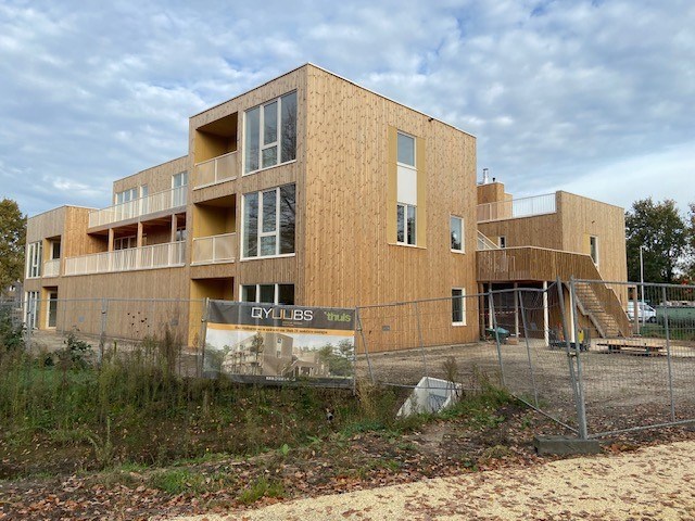 De nieuwe appartementen zijn gebouwd door Qyuubs in opdracht van ’thuis. Ze zijn volledig gemaakt van kruislaaghout (CLT). Dit materiaal is biobased en zorgt ervoor dat er minder CO₂ vrijkomt bij de bouw. Bouwen met CLT gaat snel, is van hoge kwaliteit en past goed bij de groene omgeving van Buurtschap te Veld.