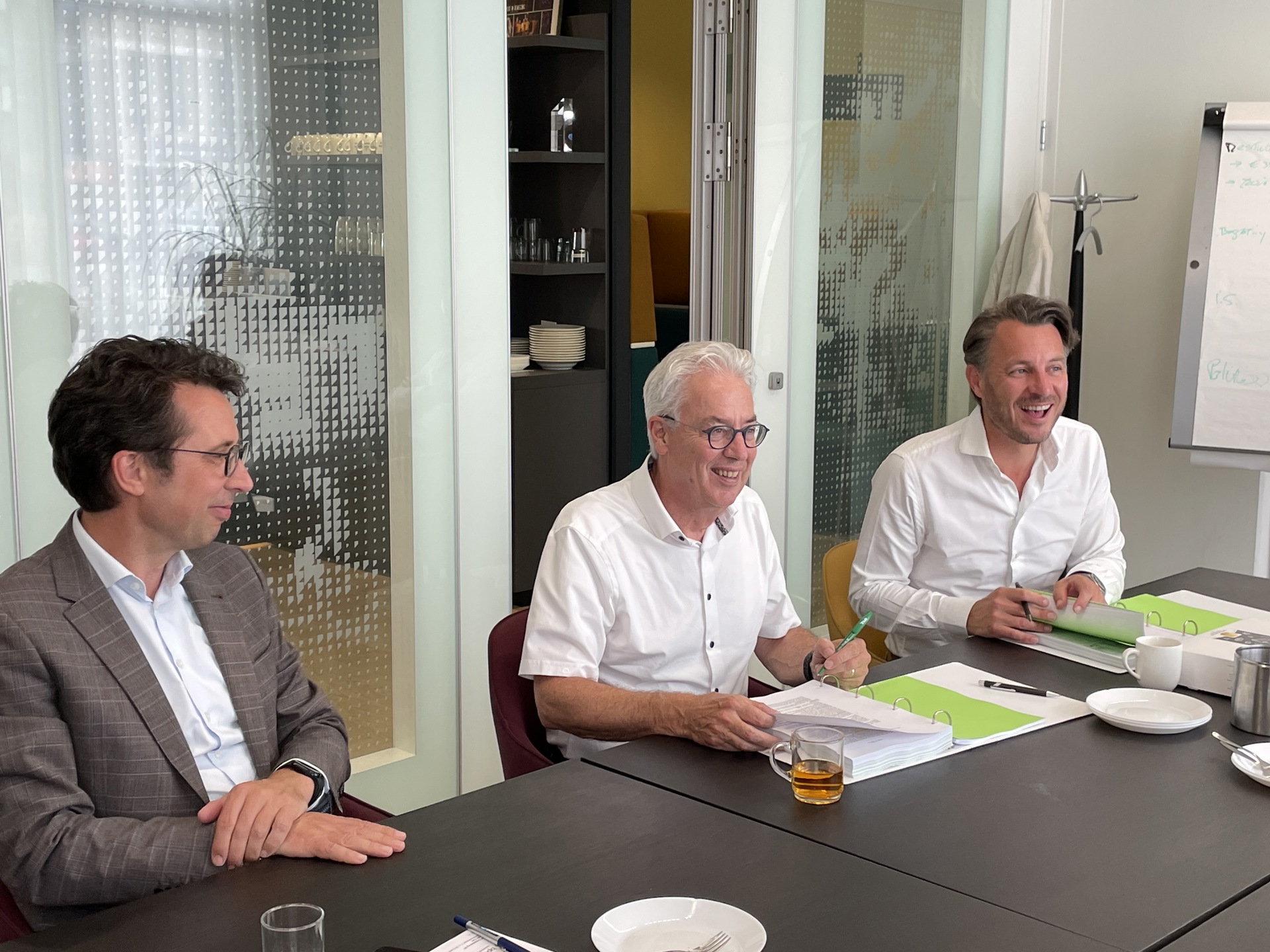 Bestuurders van de betrokken partijen ondertekenden de contracten onder het genot van een stukje taart. En poseerden daarna ook voor de foto.