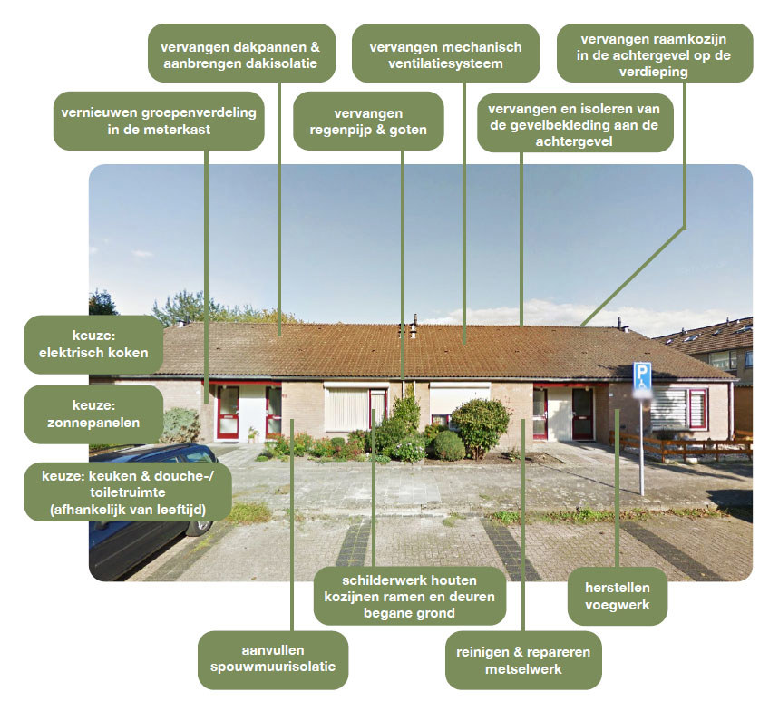 Naast groot onderhoud aan gevels, kozijnen, daken en installaties is de isolatie van de gevel en het dak verbeterd en hebben we een energiezuinige installatie geplaatst. Bewoners konden kiezen voor het vervangen van hun verouderde keuken, badkamer en toilet als deze ouder was dan 18 jaar. Zo kunnen de woningen er weer 40 jaar tegenaan. En houden we de woonlasten van de woningen betaalbaar nu de kosten voor gas en elektriciteit jaarlijks sterk stijgen.