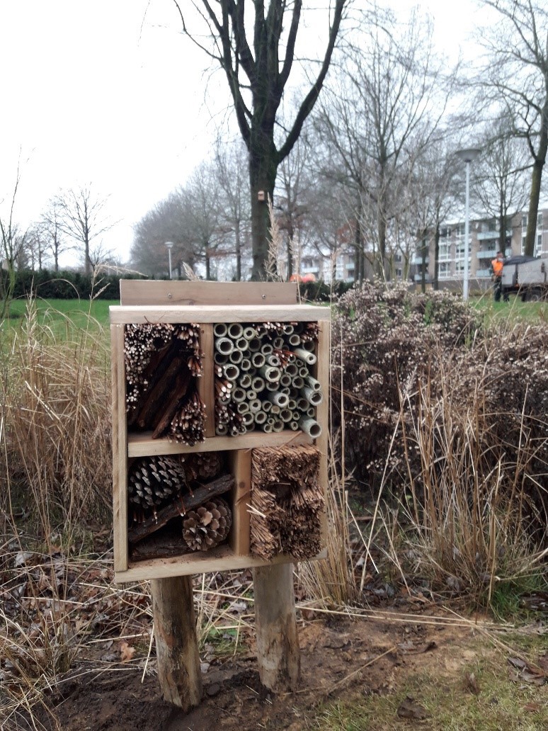 Een eerste insectenhotel is door onze groenpartner Ploegmakers opgehangen bij de Schonberglaan. Om de bio diversiteit te bevorderen is hier ook meteen een extra vlinderstruik geplaatst. Dit smaakte naar meer. We zijn gaan nadenken op welke locatie we nog meer iets extra’s kunnen doen. Daarbij was het onze wens om dit te combineren met maatschappelijk verantwoord ondernemen. Dit is gelukt! We werken inmiddels samen met Kempenhaege dagbesteding. Hier maken mensen met gevonden materiaal uit bossen zelf insectenhotels. Ze werken hierbij samen met Staatsbosbeheer.