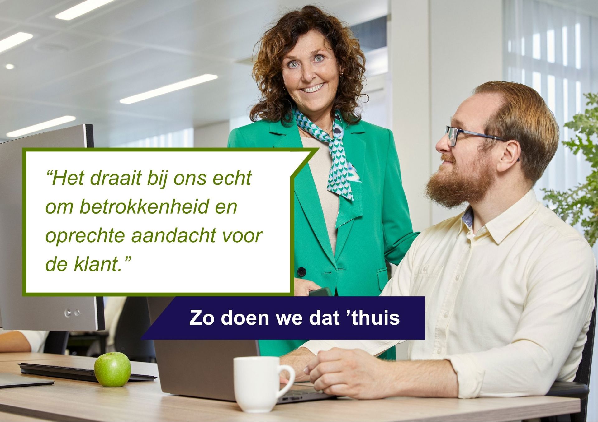 Het team van klantadviseurs is een hechte groep van vijftien collega’s. Rinette legt uit: “We zijn goed op elkaar ingespeeld, alsof we een geoliede machine zijn. Maar we hebben ook veel lol samen.” Er is altijd ruimte om even te sparren en elkaar op weg te helpen. Naast het dagelijkse werkcontact is er ruimte voor ontspanning: van spelletjesavonden tot gezamenlijke lunches. Teamuitjes versterken die band nog meer. Zo doen wij dat ’thuis. Samen ’thuis